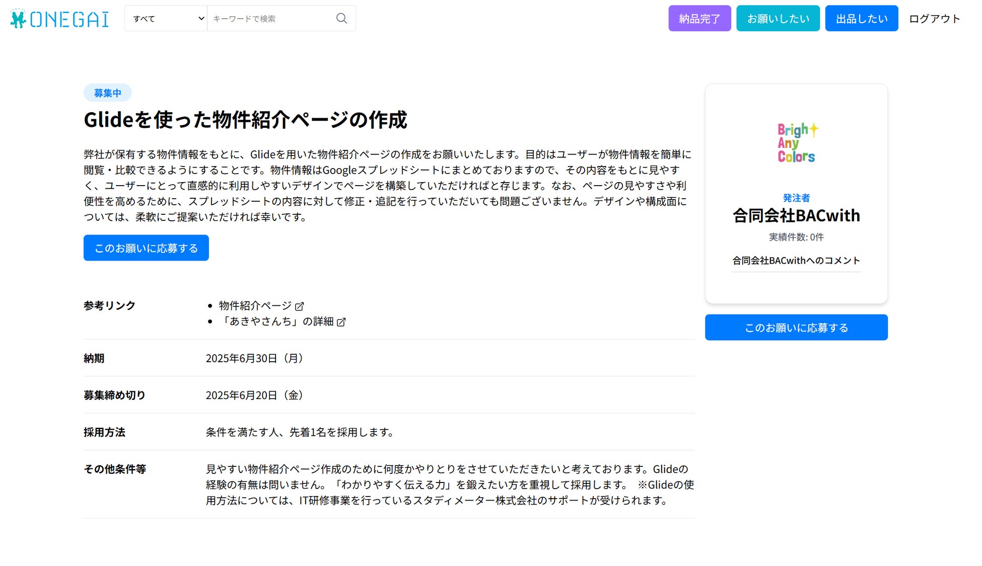 これまでのONEGAIは、スキルを持つ中高生が自身のプロフィールを公開し、依頼者が個別にコンタクトを取る形式でしたが、新たに依頼者が具体的な案件をサイトに掲載し、興味を持った中高生が応募する方式を開始しました。