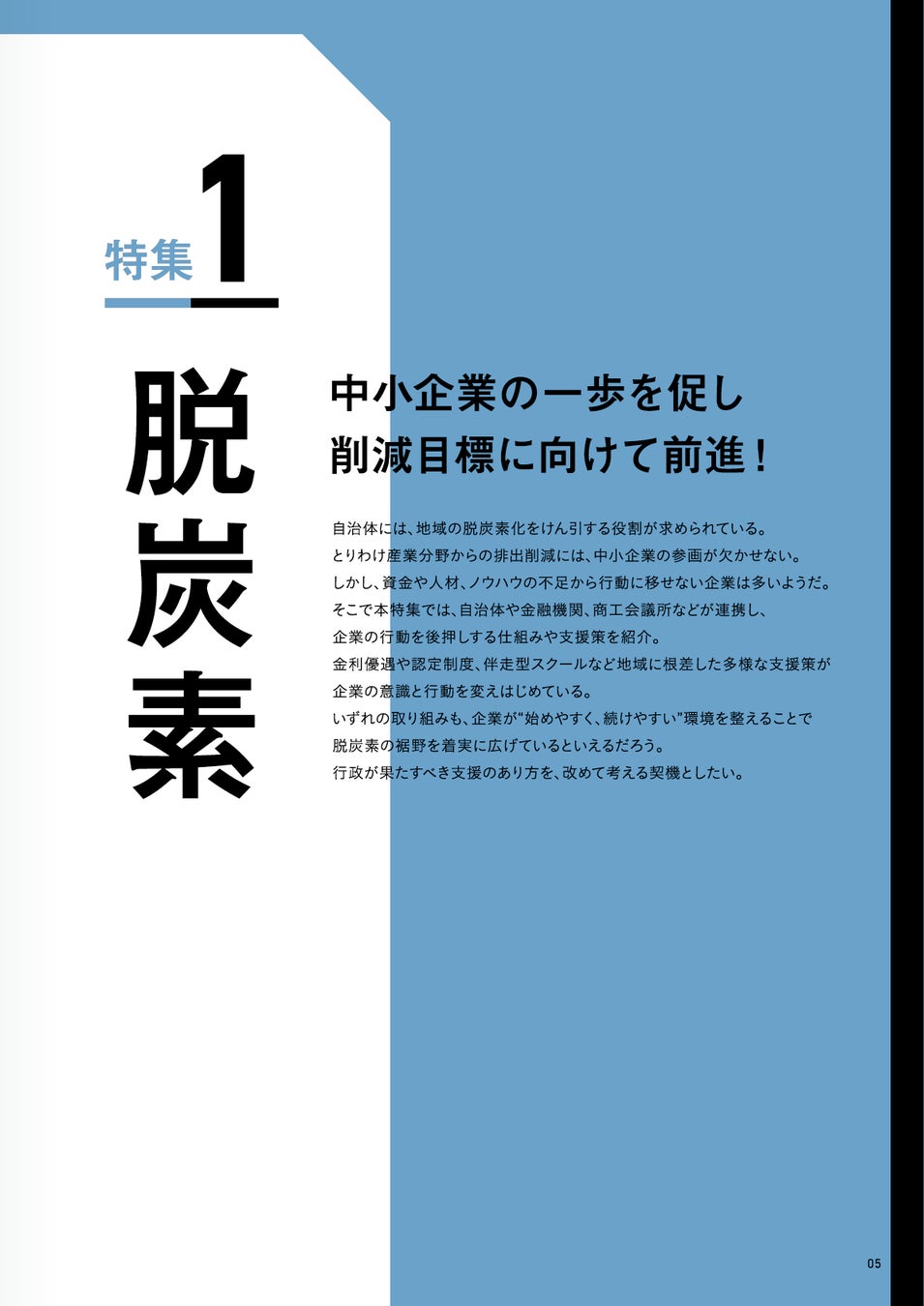 今号の特集1では、「[脱炭素]中小企業の一歩を促し削減目標に向けて前進!」をテーマに、京都府、愛知県豊田市、神奈川県横浜市、兵庫県尼崎市などの事例をご紹介しております。特集2では、「[文化・芸術]子どもの“能動的な体験”が文化を次代へつなぐ。」をテーマに、大阪府河内長野市、埼玉県小鹿野町、富山県などの取り組みをご紹介しております。