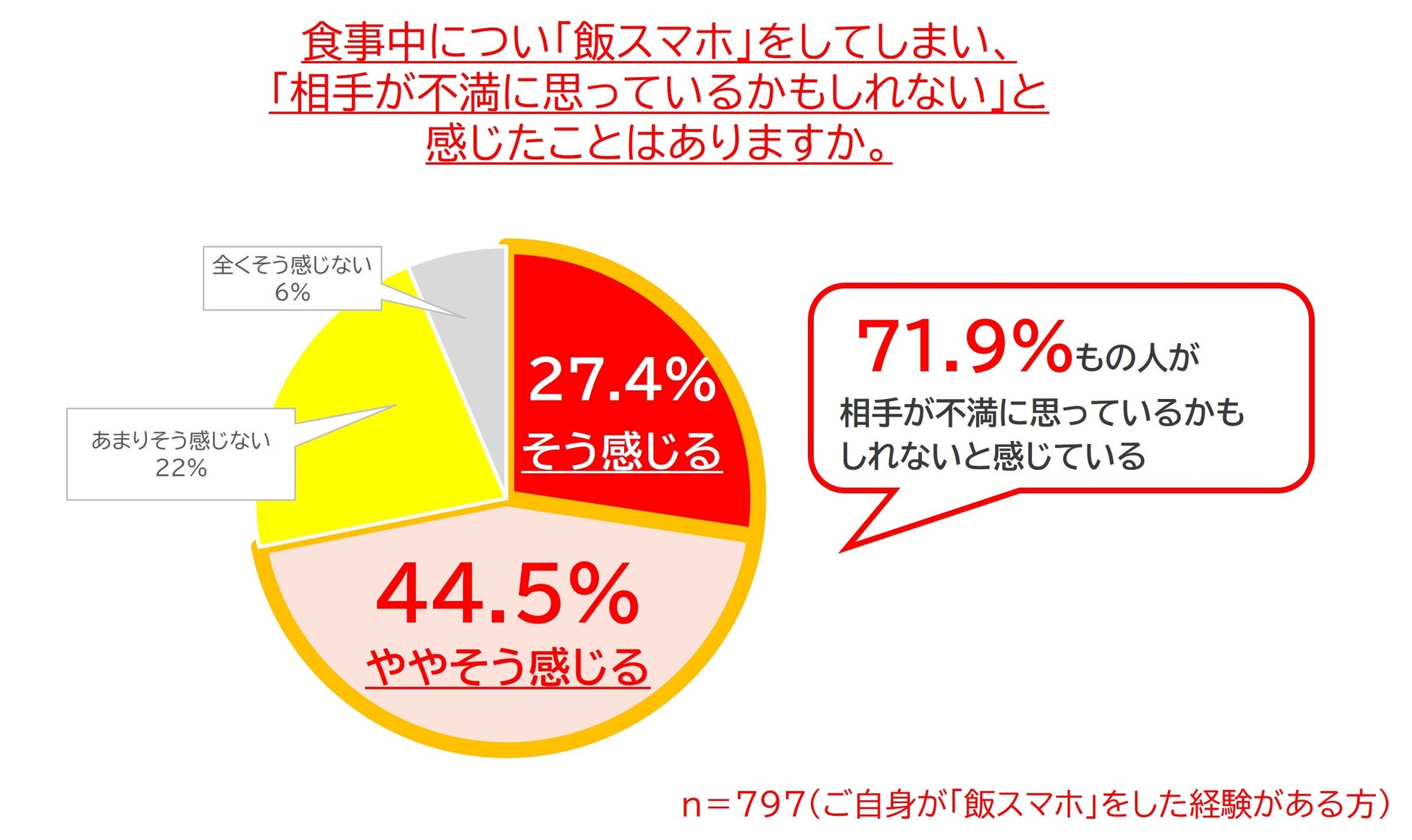 さらに、調査対象全員に食事中に自分自身がスマホを触った経験がありますかと質問したところ、「はい」と答えた人が70.4%となりました。一方、自分自身が食事中にスマホを触った経験があると答えた方に、「相手が不満に思っているかもしれない」と感じたことはありますかという質問に対しては、「そう感じる」、「ややそう感じる」の合計が71.9%となり、7割以上の人が「相手が不満に思っているかもしれない」と思いながら、食事中にスマホを触ってしまっていることが伺えます。