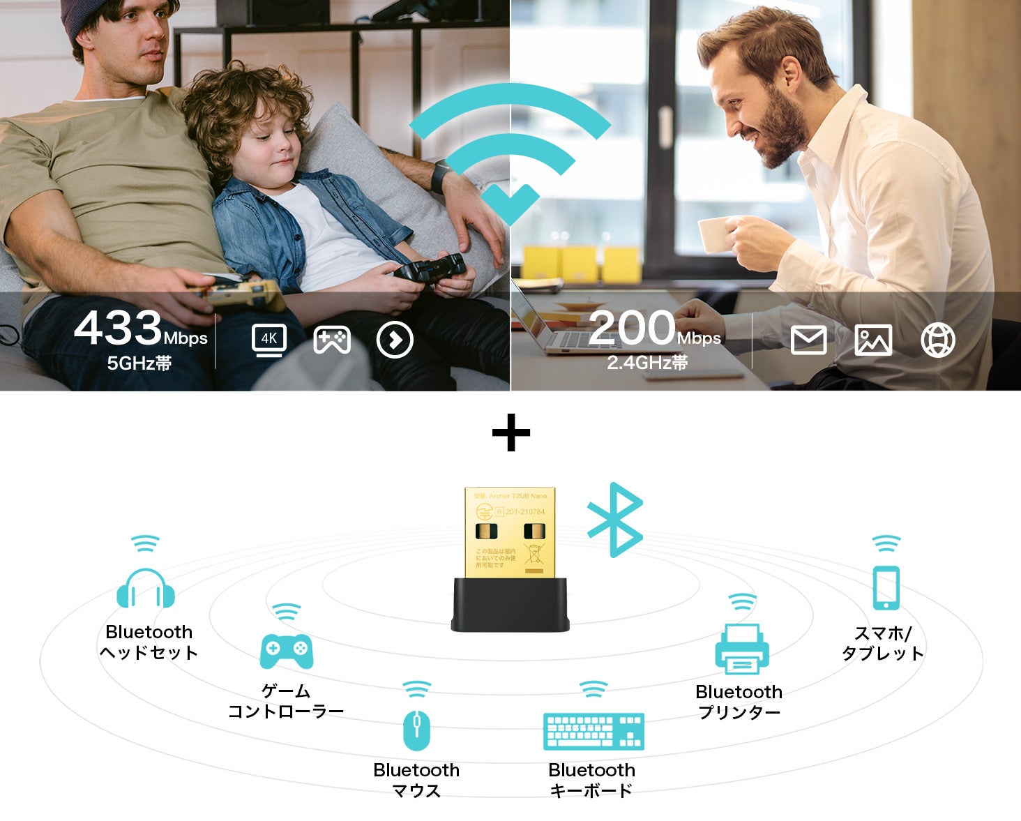 「Archer T2UB Nano」は、Wi-FiとBluetooth接続の両方を叶える2in1 USB Wi-Fi子機。2in1シリーズ初となるナノモデルとなっており、端末のUSBポートに挿したままでも邪魔になりません。合計で最大633Mbps(5GHz:433Mbps + 2.4GHz:200Mbps)の速度を提供するだけでなくBluetooth接続も追加可能なため、手軽に無線LAN環境をアップグレードできます。