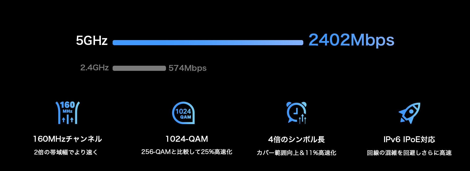 ・ Wi-Fiスピード*1:2402Mbps (5GHz,11ax/ac/n/a,HE160) + 574Mbps (2.4GHz,11ax/n/g/b)