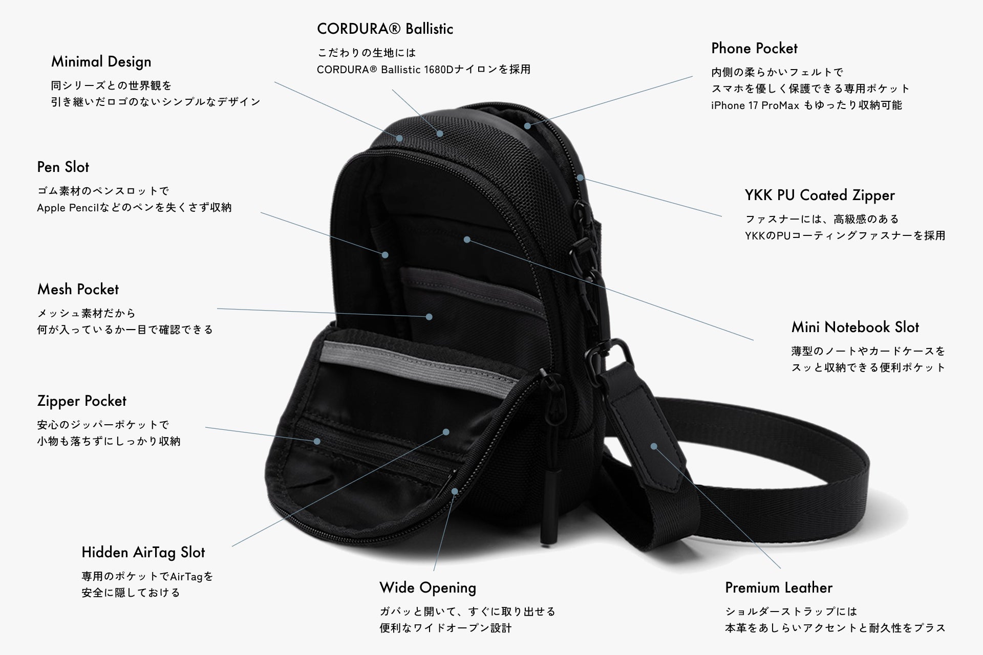 メイン素材には、CORDURA® Ballistic 1680D を採用し、軽さ・耐摩耗性・耐水性・触り心地にこだわりました。ショルダーストラップには本革を組み合わせ、高級感と耐久性をプラスしています。