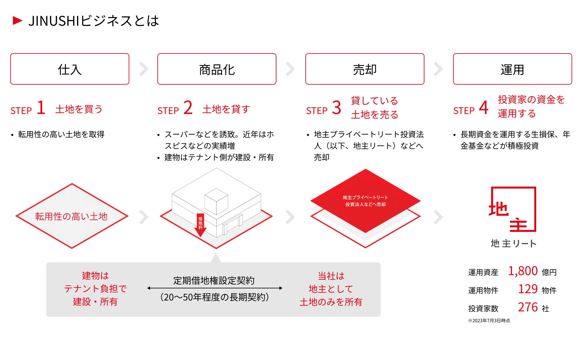 当社は、2000年の創業以来、独自の不動産投資手法であるJINUSHIビジネスに取り組んでまいりました(参考:後記「JINUSHIビジネスとは」)。自然災害やマーケットボラティリティに強く、長期にわたり安定的に収益を得ることができるJINUSHIビジネスに対するニーズは、年金基金や生損保などの機関投資家を中心に、今なお高まり続けております。