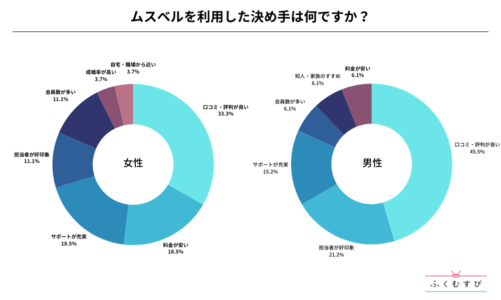 ・女性がムスベルを利用した決め手は、口コミ・評判が良いが1位、料金が安いが2位となりました。