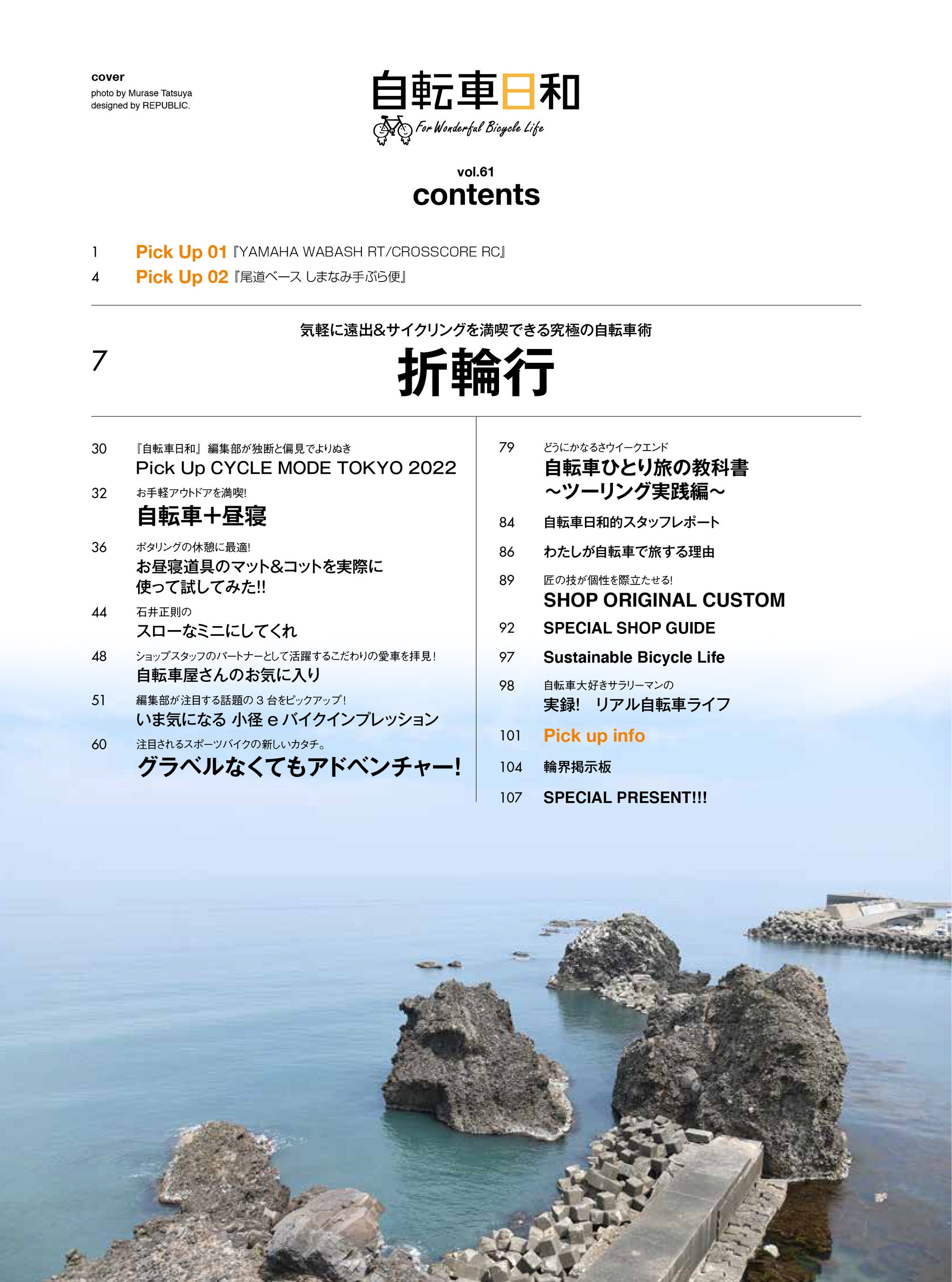 レースやトレーニング志向ではなく、「選ぶ」「乗る」「カスタムする」などの幅広い楽しみ方を提案。初心者・ベテランを問わず、自転車のある生活を自分のペースで楽しみたい方々のための自転車ライフスタイル誌です。