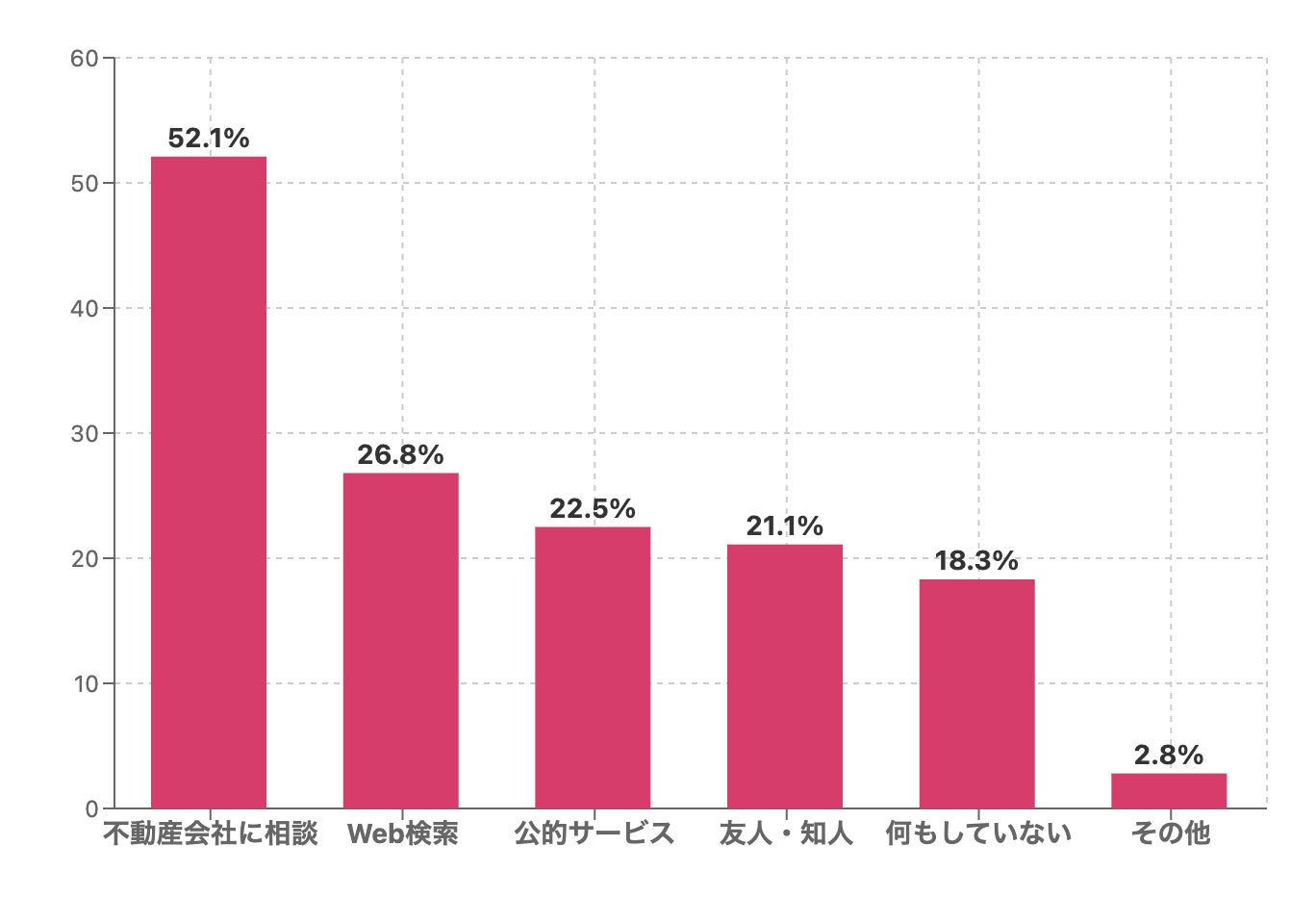 その結果、最も多かった行動は「不動産会社に問い合わせ・相談」で、52.1%と半数を超えました。次いで「Web検索で情報収集」(26.8%)、「空き家バンクなど公的サービスに相談」(22.5%)、「友人・知人に相談」(21.1%)が続きました。専門家への相談を第一歩とする人が多い一方で、Webや公的サービス、個人的な繋がりなど、多様な手段が活用されていることがうかがえます。