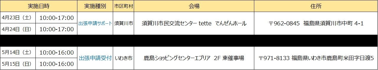 ※開催場所の調整状況や新型コロナウィルスの感染状況等により、「出張申請受付」及び「出張申請サポート」の開催を中止・延期、または実施内容が変更となる可能性がございます。