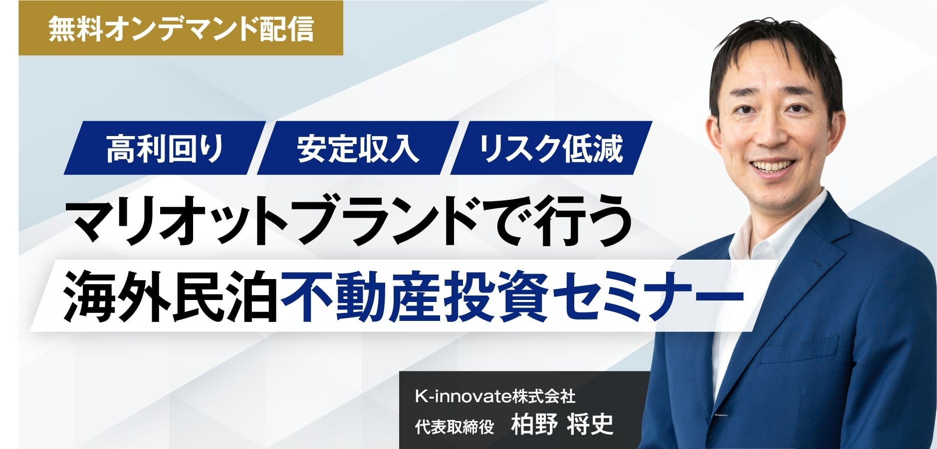 一般社団法人企業共創支援機構(所在地:東京都港区 代表理事:小沼勢矢)は、2024年4月17日に30年以上、中小企業の経営指導や支援に従事し、現地デベロッパーと提携する、K-innovate株式会社 代表取締役 柏野 将史 氏をお迎えし「マリオットブランドで行う海外民泊不動産投資セミナー」を開催を報告するとともに、無料オンデマンド配信を開始することを発表します。