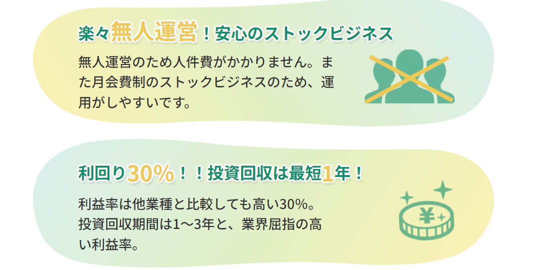 高い利益率によって投資回収期間は1年〜3年と早期投資回収が可能となっております。
