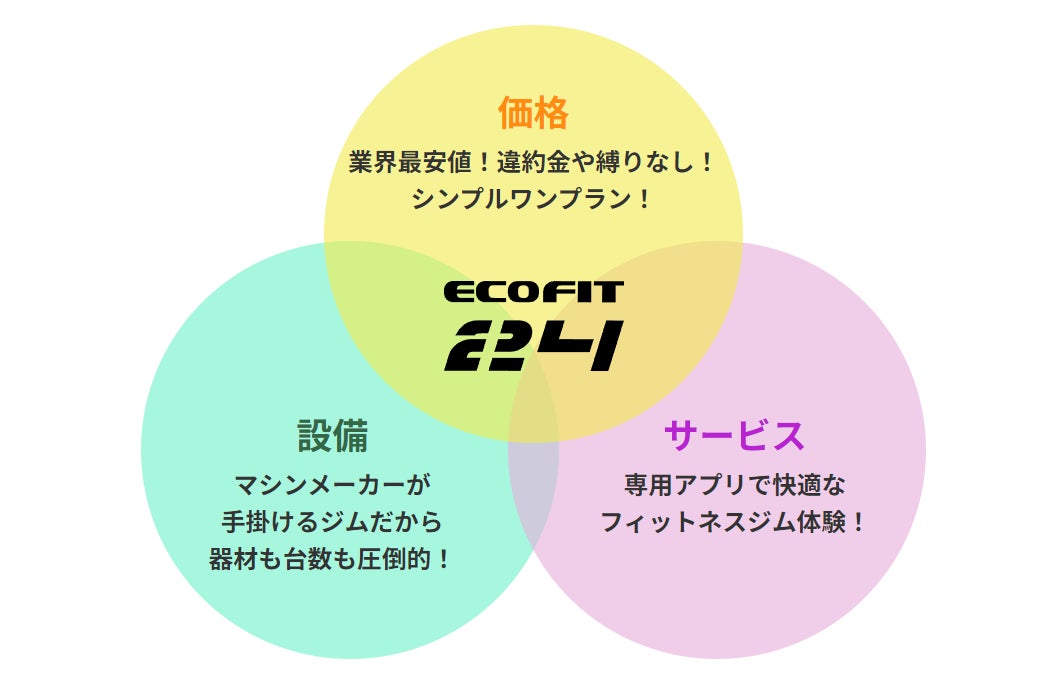 エコフィット24は「24H×GYM×IT」によって様々なお客様が快適なフィットネス体験ができるジムを提供しています。