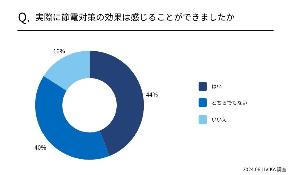 実際に家電の使い方を工夫するなどして節約を心掛けた結果、実際に節電効果を感じている人は半数程度でした。