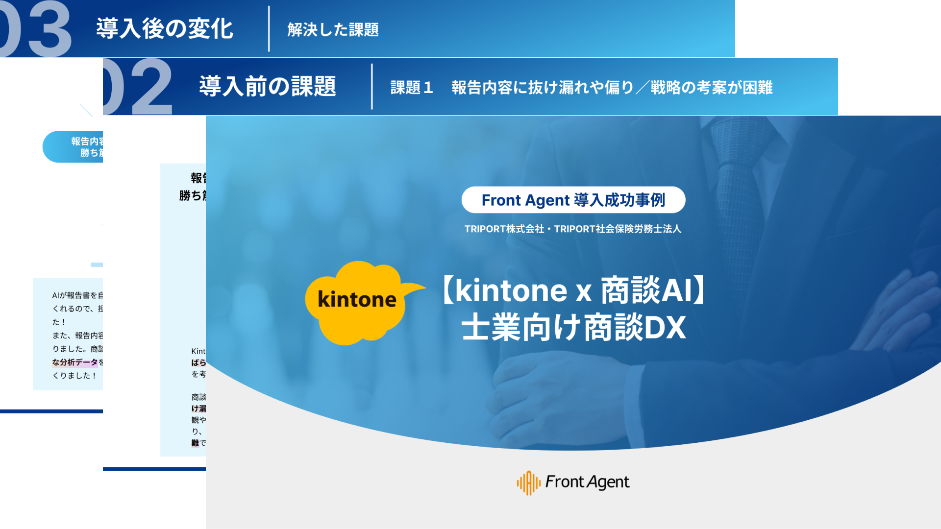 商談の成功パターンから会話のアシストAIを自動生成する商談アシストプラットフォーム「Front Agent」を開発するUmee Technologies株式会社は、昨年5月に公開し大好評頂いたホワイトペーパー「【kintone×商談AI】士業向け商談DXの成功事例」を士業のお客様を伴走支援させて頂いた実績を交えて更新し無料公開しました。