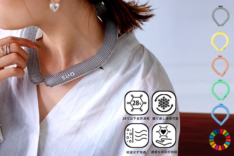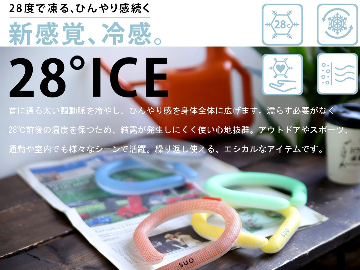 「28℃ ICE」は、アメリカのNASA(宇宙航空局)で宇宙探査時に激しい温度変化から宇宙飛行士を保護するために研究開発された、温度調節機能を持つ植物由来(※1)の潜熱蓄熱材「PCM」を採用した、28℃以下の環境(冷凍庫・冷蔵庫・流水・車のエアコンなど)で自然凍結するネック用クールリング(特許取得済み・※2)。シリーズ累計販売数は50万個を突破しています。