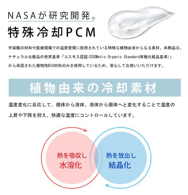 アメリカのNASA(宇宙航空局)で宇宙探査時に激しい温度変化から宇宙飛行士を保護するために研究開発された、温度調節機能を持つ植物由来の潜熱蓄熱材「PCM」を採用。28℃以下の環境で自然凍結します。