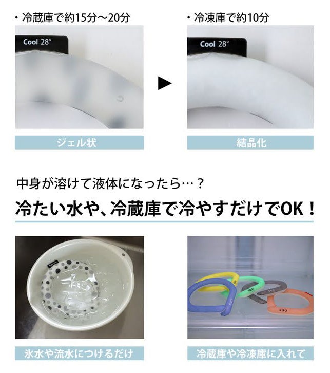 温度環境に応じて凍ったり溶けたり(固体⇔液体)を繰り返しながら、吸熱・放熱する画期的なクールリング「28℃ ICE」。水溶化したジェルが28℃以下の環境において再び結晶化することで、半永久的に繰り返し使うことができます。周囲の温度が上昇して液状化しても最大28℃をキープ。28℃以上に上昇することはありません。28℃以下の環境なら屋内・屋外問わず自然に氷のように結晶化し長く効果が持続。上昇した体温を適度に冷やすことができます。