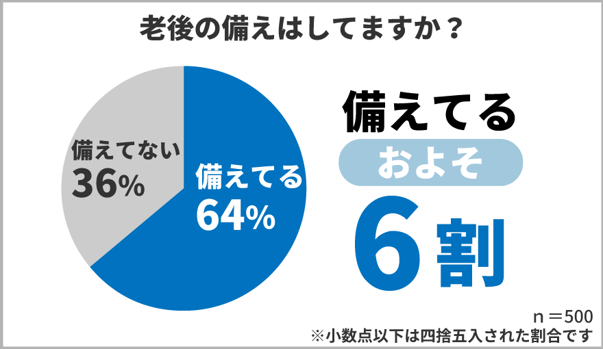 健康面と金銭面の両方の観点から「老後の備えはしていますか?」と質問したところ、64%の方が「備えている」と回答されました。