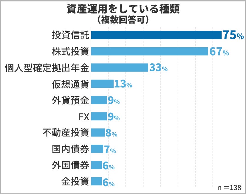 老後の備えに「資産運用を行っている」と回答された138名に、具体的にどのような資産運用を行っているのか聞いてみたところ、多くの方が「投資信託」と「株式投資」の両方を運用していることが分かりました。