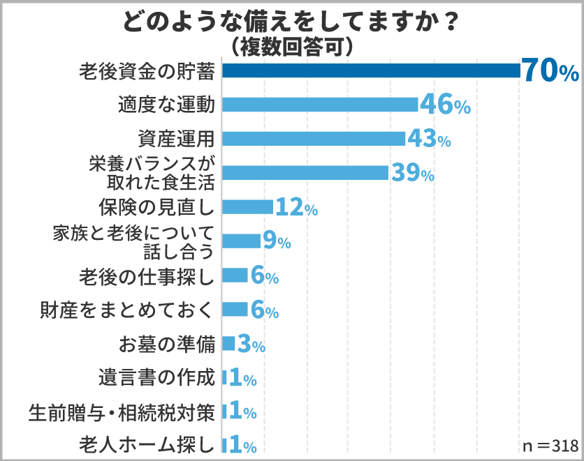 「備えている」と回答した318人に「健康寿命」と「資産寿命」の両方を伸ばす為に、具体的にどのような備えをしているのかも聞いてみました。