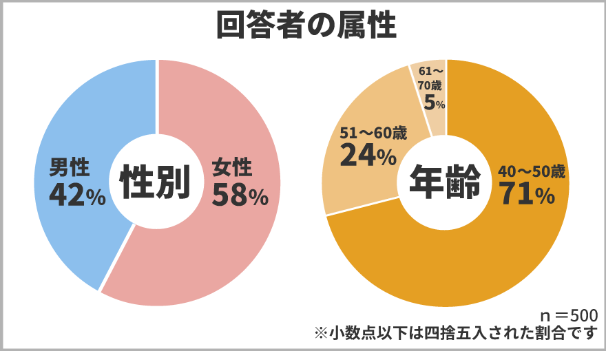 今回ご協力頂いたのは、40歳以上の方男女500人、割合は以下の通りです。