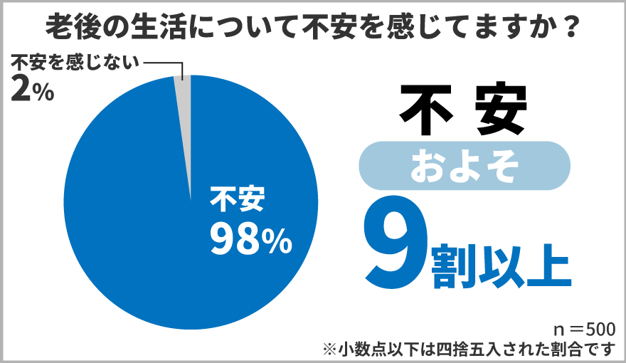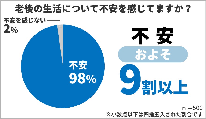 「老後の生活について不安を感じていますか?」と40歳以上の男女500人に質問したところ、「不安を感じている」と回答した方が9割を超える結果となりました。