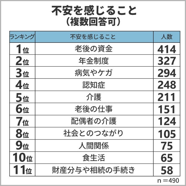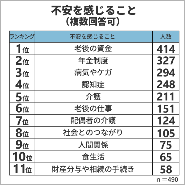 また「自分が病気になってしまうこと」や「認知症を患ってしまうかもしれない」などの健康面の不安も上位となっています。