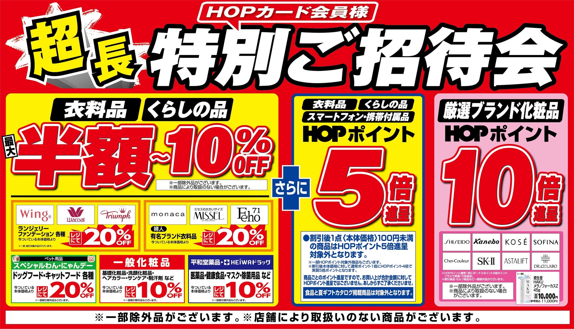 衣料品とくらしの品は、この7日間、最大半額から10%割引、また、均一価格やレジにて割引企画のほか、お買い上げ時のHOPポイント5倍進呈いたします。