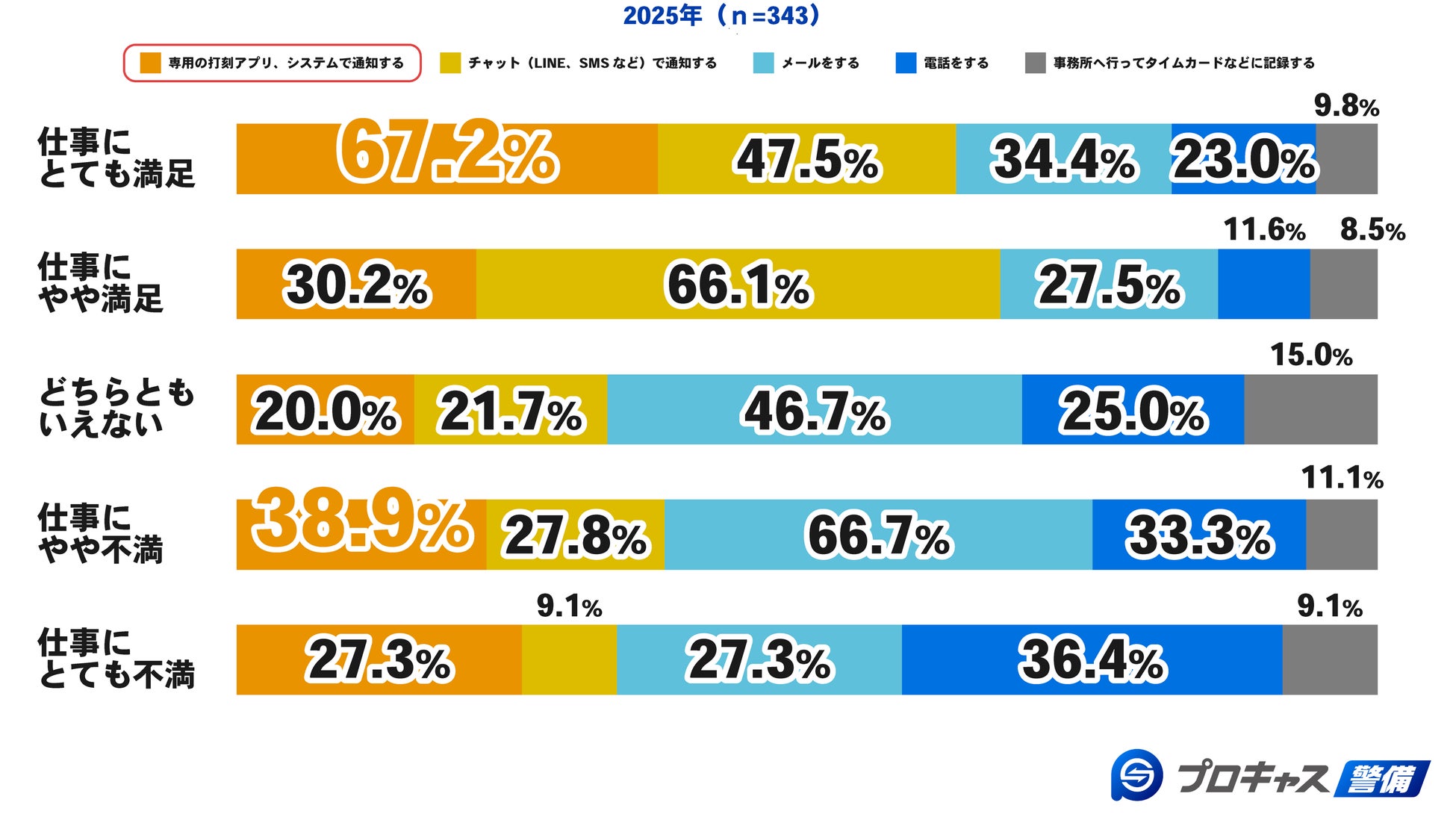 現在も警備員として勤務している人の仕事の満足度と上下番報告方法の相対関係を調べた結果、仕事に「とても満足」と回答した67.2%の人が「専用の打刻アプリ・システム」を利用していることが分かりました。しかし、次に多いのが38.9%で「やや不満」と回答した人であり、仕事の満足度が勤怠方法の利便性だけに比例しているわけではないことも明らかになりました。