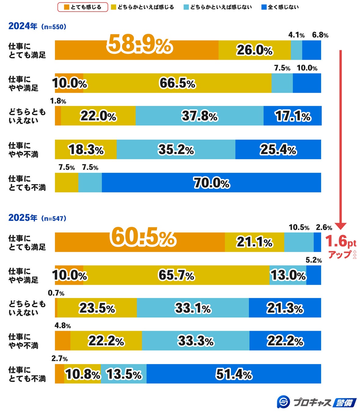昨年は「警備員の仕事にとても満足」と回答した人のうち、業務のデジタル化が進んでいると「とても感じる」人は58.9%でした。これに対し、今年は60.5%で1.6ポイント増加したことがわかります。