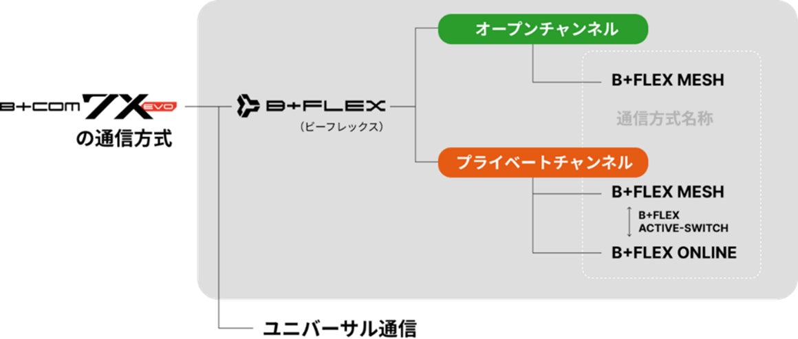 「B+COM 7X EVO(ビーコム セブンエックス エボ)」は、メッシュ通信とオンライン通信の2つの通信方式を採用した新開発の通信方式「B+FLEX」を搭載。「B+COM 7X EVO」では、この2つの通信方式を自動で最適な方式に切替えるハイブリッド型で、走行中に切替えを意識せずシームレスな通話ができます。