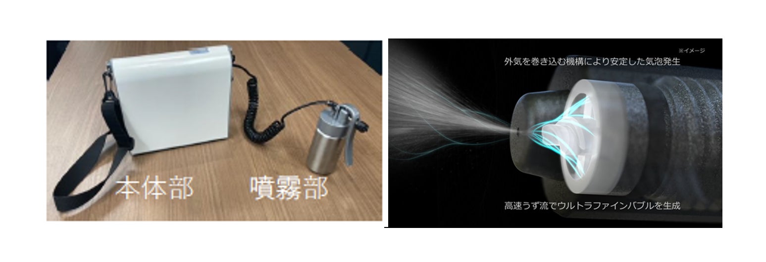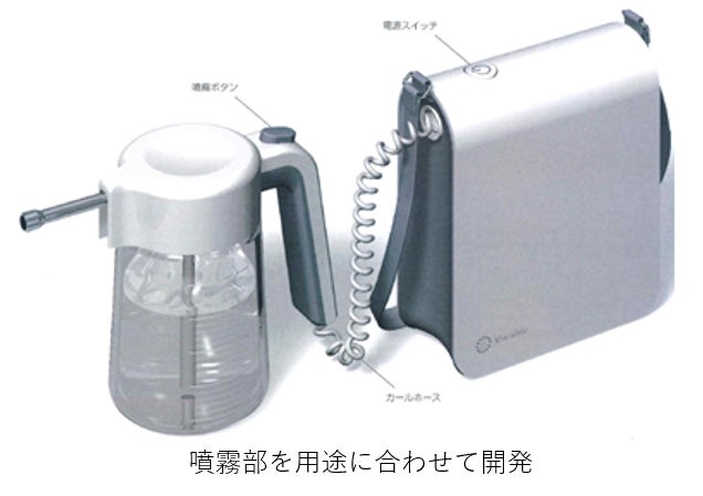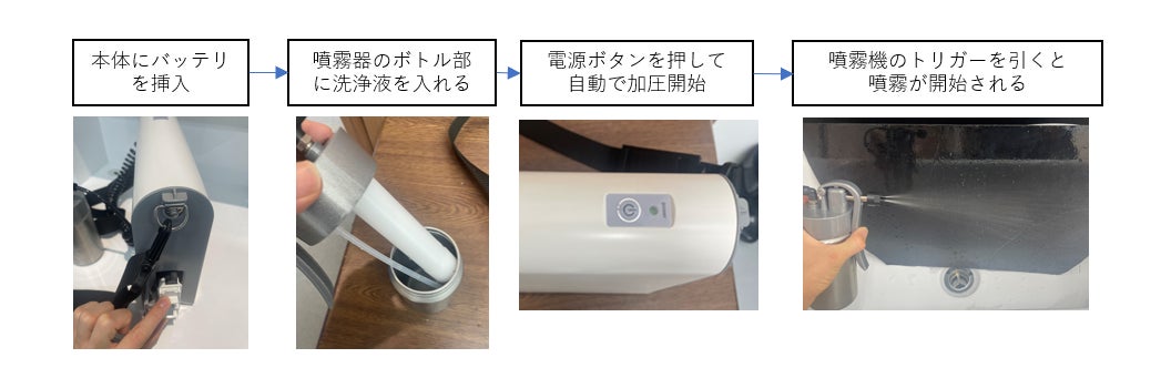 大きいことから、ミラブルテクノロジーでの効果だけでなく節水や機材重量の低減も可能であることに着目し、バッテリ駆動の噴霧機構を開発することとした。吐水量を0.2L/分未満が可能となり、保水タンクも小型化に成功した。機材の準備時間等も短縮され、洗浄前後に必要な時間も効率化が図れる。今後、様々な機能性水などとも組み合わせを狙う。