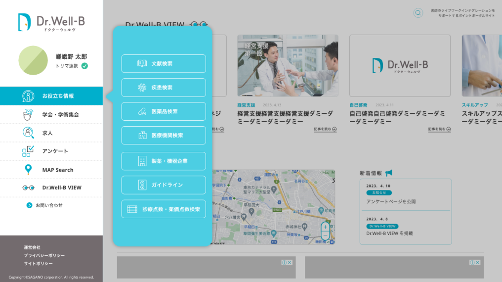 医療コンサルタントの嵯峨野が構築する「医師/歯科医師データベース・ネットワーク情報」を連携させた医家向けのライフワークインテグレーション*・ポイントポータルサイトです。医療や薬剤情報など医師向けの専門情報のほか、求人や書籍等の物販、開業支援、生活・趣味・嗜好といったライフワークサービスに関する会社情報を提供します。