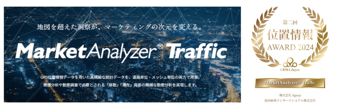 技研商事インターナショナル株式会社(名古屋本社:愛知県名古屋市、東京本社:東京都新宿区、代表取締役:小嶌智海、以下当社)は、位置情報データを活用したマーケティングやサービス施策の促進を目的に活動する91社の業界連合である、一般社団法人LBMA Japan(東京都千代田区、代表理事:川島邦之、以下「LBMA Japan」)が開催する、「第2回位置情報アワード2024」において、株式会社Agoop(アグープ、本社:東京都渋谷区、代表取締役社長 兼 CEO:加藤有祐、以下「Agoop」)との共同ソリューション「MarketAnalyzer® Traffic」が最優秀賞に選出されたことを発表します。