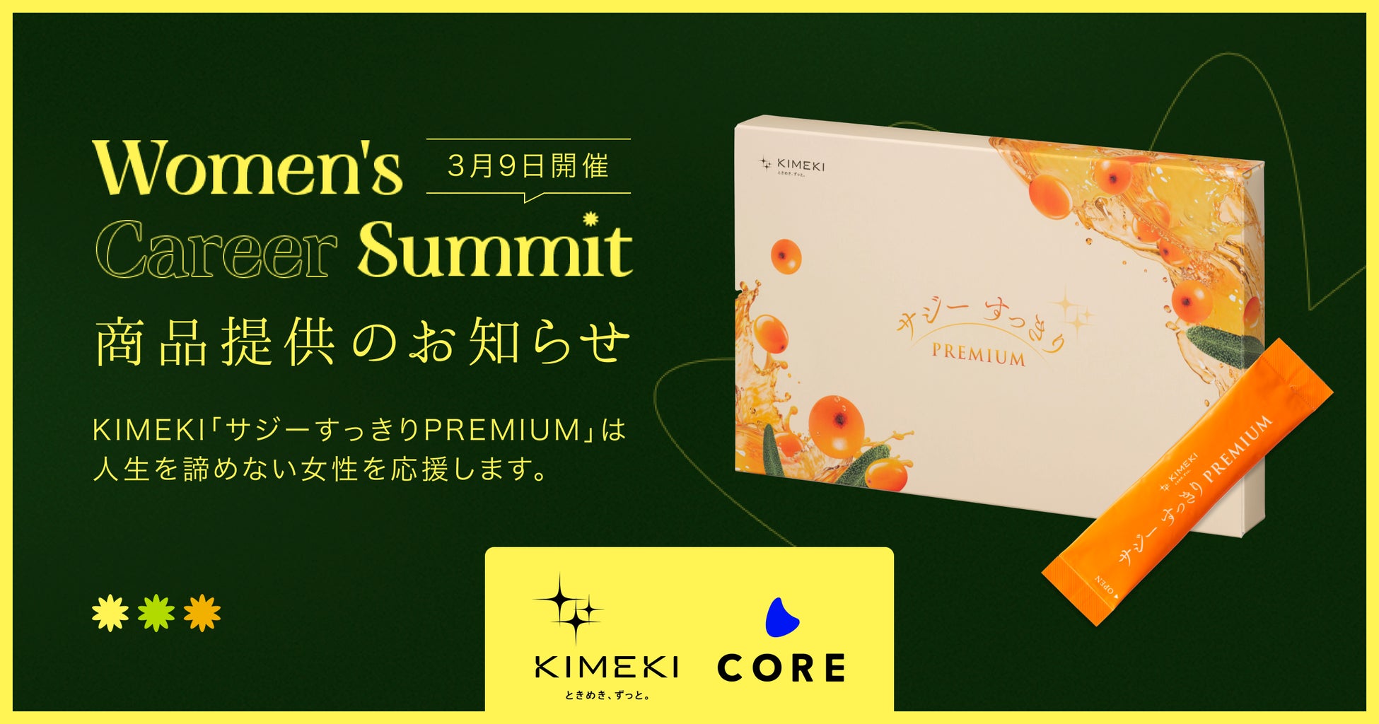 株式会社京福堂(本社所在地:大阪府大阪市 代表取締役社長 関 崇樹)が提供している10種の美容素材と鉄分を配合したパウダー飲料 KIMEKIの『サジーすっきりPREMIUM』(以下「KIMEKI」)は、株式会社CORE(本社:東京都中央区、代表取締役:尾崎莉緒)が運営する「Women’s Career Summit」にて、来場者プレゼントとしてKIMEKIの『サジーすっきりプレミアム』(以下、KIMEKI)を提供いたします。