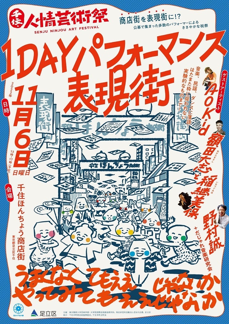 江戸時代から人々の交流と文化の根付く場所であった千住ほんちょう商店街(旧日光街道)を舞台に、公募で集まった多様なパフォーマーがまちで表現を繰り広げるほか、ゲストアーティストによる特別パフォーマンスも行います。