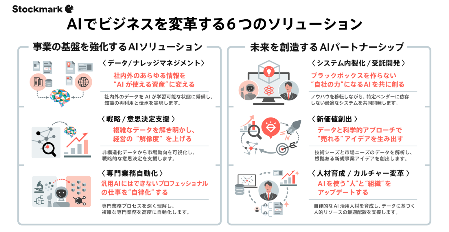 本提携により、ストックマーク社の高度なAI技術やデータ構造化ソリューションと、当社が持つ熟練者の思考プロセスを可視化するソリューションを融合。属人化されたナレッジを組織の資産へと変換し、事業企画、R&D、マーケティング、セールスの各部門の連携を強化するAI環境を提供します。