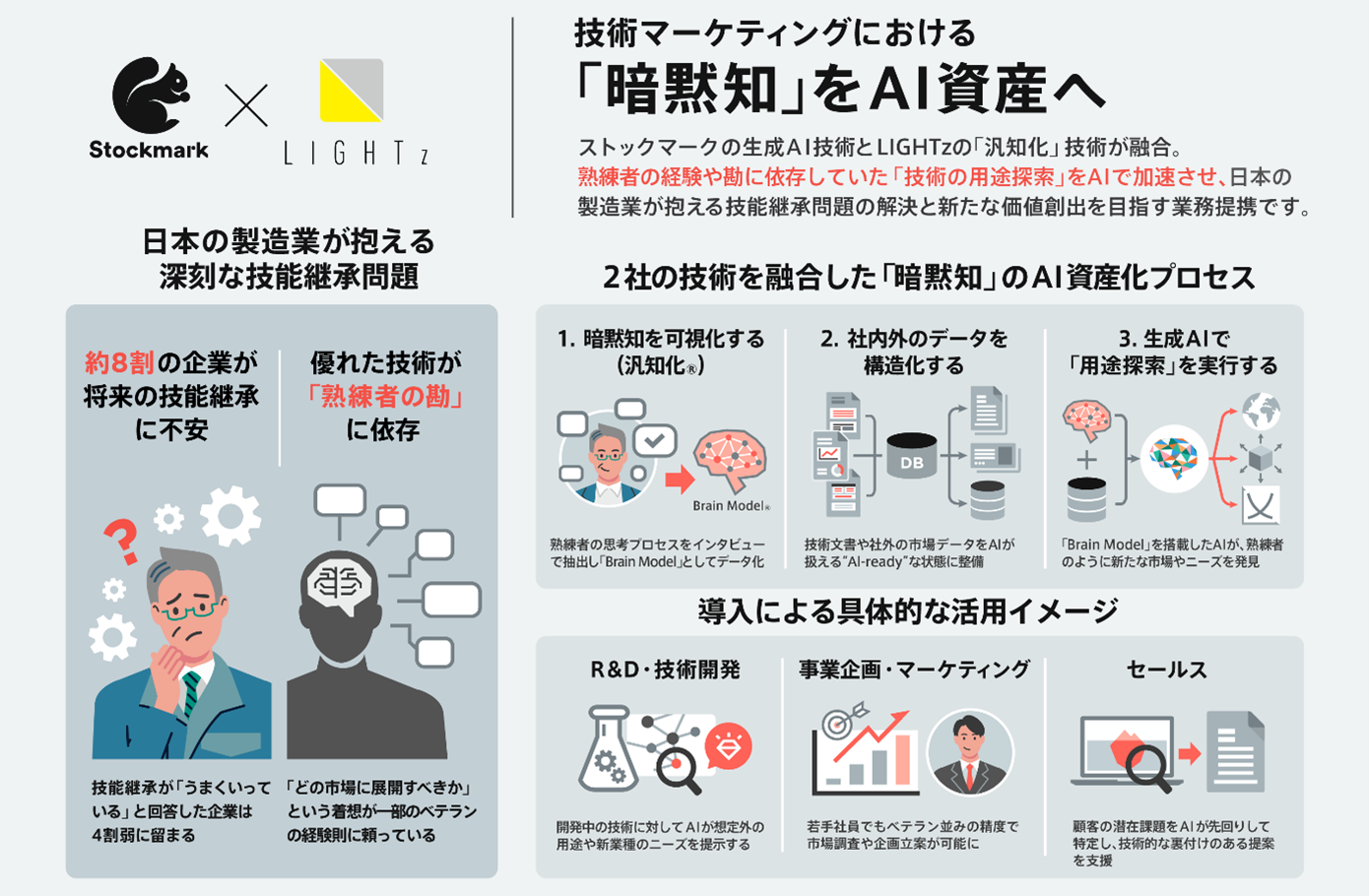 熟練者の暗黙知の可視化、AI化技術(「汎知化®」)を持つ株式会社LIGHTz(本社:茨城県つくば市、代表取締役社長CEO:乙部 信吾)は、国産生成AI基盤の独自開発や生成AIサービスを提供するストックマーク株式会社(本社:東京都港区、代表取締役CEO:林 達)と、製造業の技術マーケティング/新規用途探索領域におけるソリューション強化を目指した業務提携を開始いたしました。