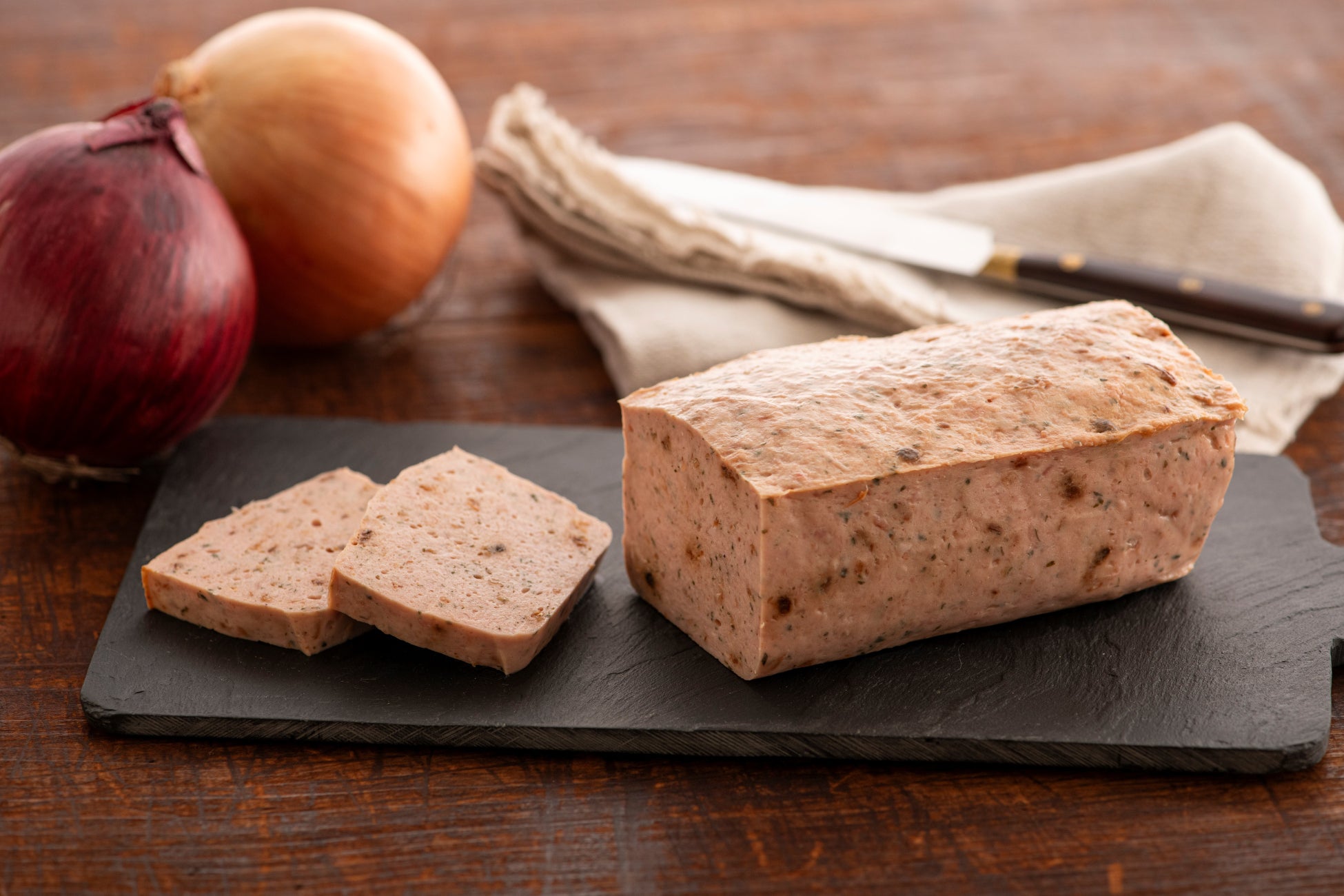 「いくとせ」自慢のソーセージの細挽き生地と、芳醇なローストタマネギの香りと食感が楽しめる「タマネギぐるりこ®」を混ぜて焼き上げた、国産豚肉100%で 作ったジャーマンミートローフです。