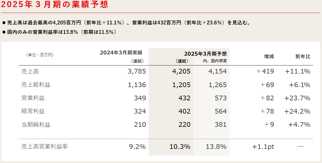 2025年3月期の業績予想につきまして、売上高は前期比11.1%増の42億500万円を見込んでおります。
