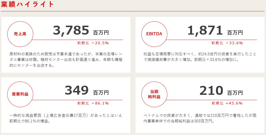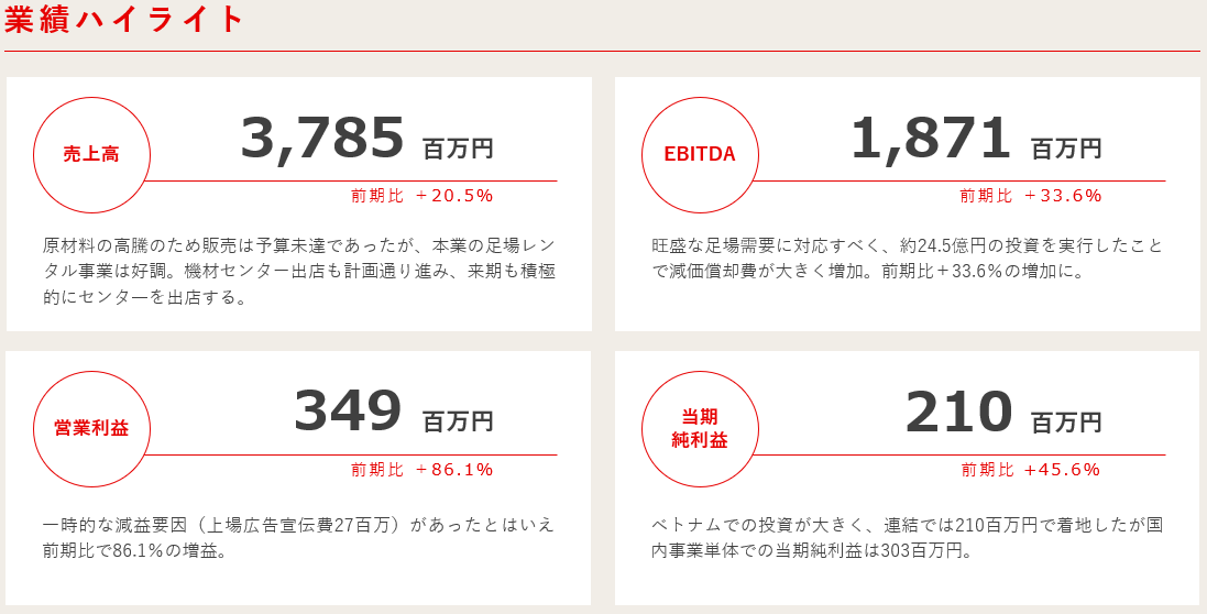 前期は24億円の足場投資、足場機材の高騰、機材センターの新規出店もあり売上原価が大きく増加しましたが、お客様も足場購入を控える傾向にあり、レンタルへの移行が進んだことで、機材の高稼働率が続いた年となりました。