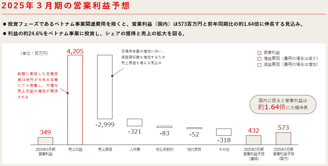 ベトナムへの投資を積極的に行いますが、それらを加味しても過去最高益の4億3,200万の営業利益を予想しております。