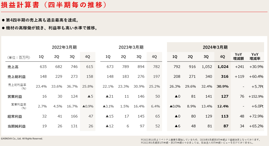 2024年3月期第4四半期においても、売上高・営業利益ともに過去最高の結果となりました。