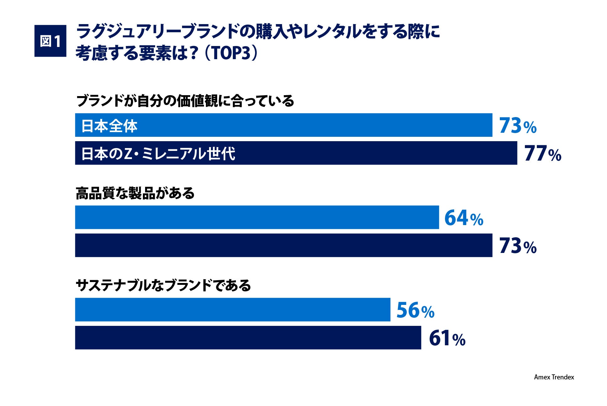 日本ではラグジュアリーアイテムの購入やレンタルをする際に考慮する要素TOP3として、「ブランドが自分の価値観に合っている(73%)」、「高品質な製品である(64%)」、「サステナブルなブランドである(56%)」となっており、特にZ世代・ミレニアル世代では、その傾向がより強いことが分かりました。【図1】