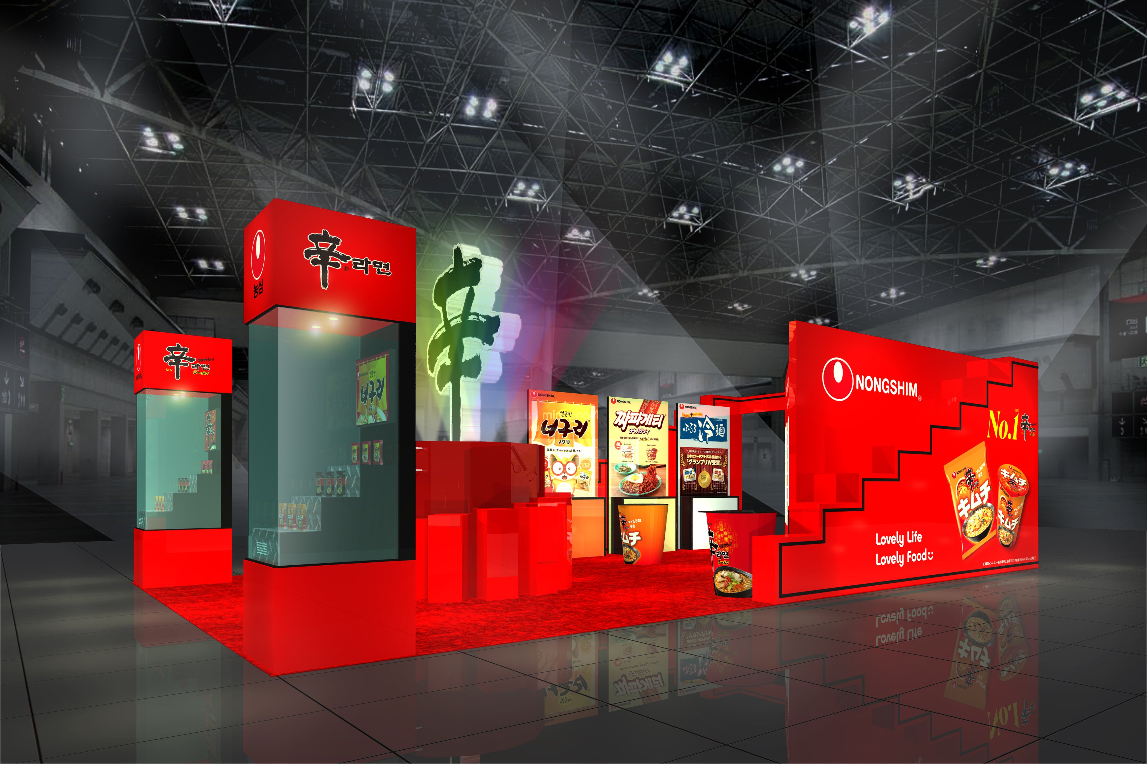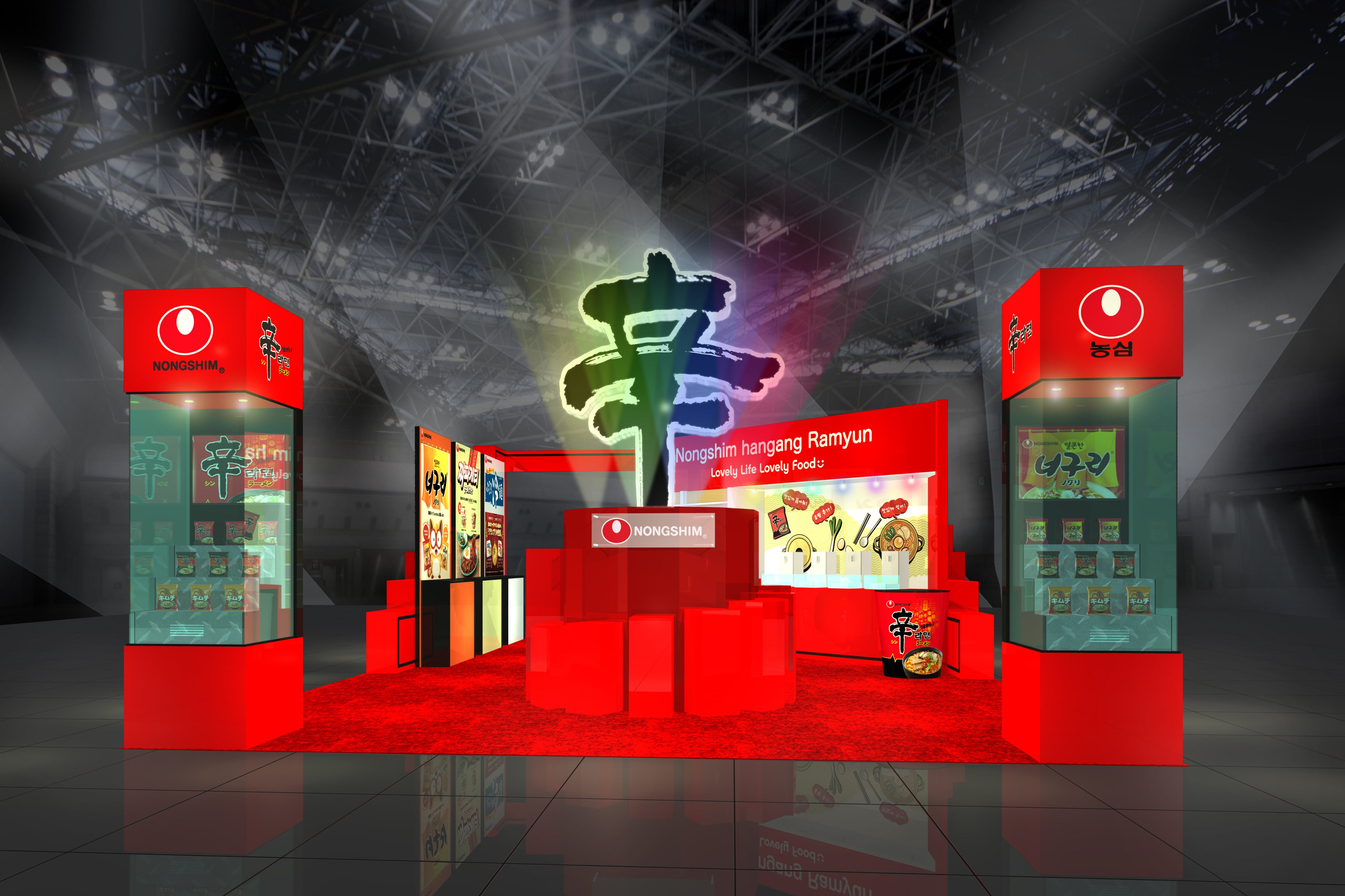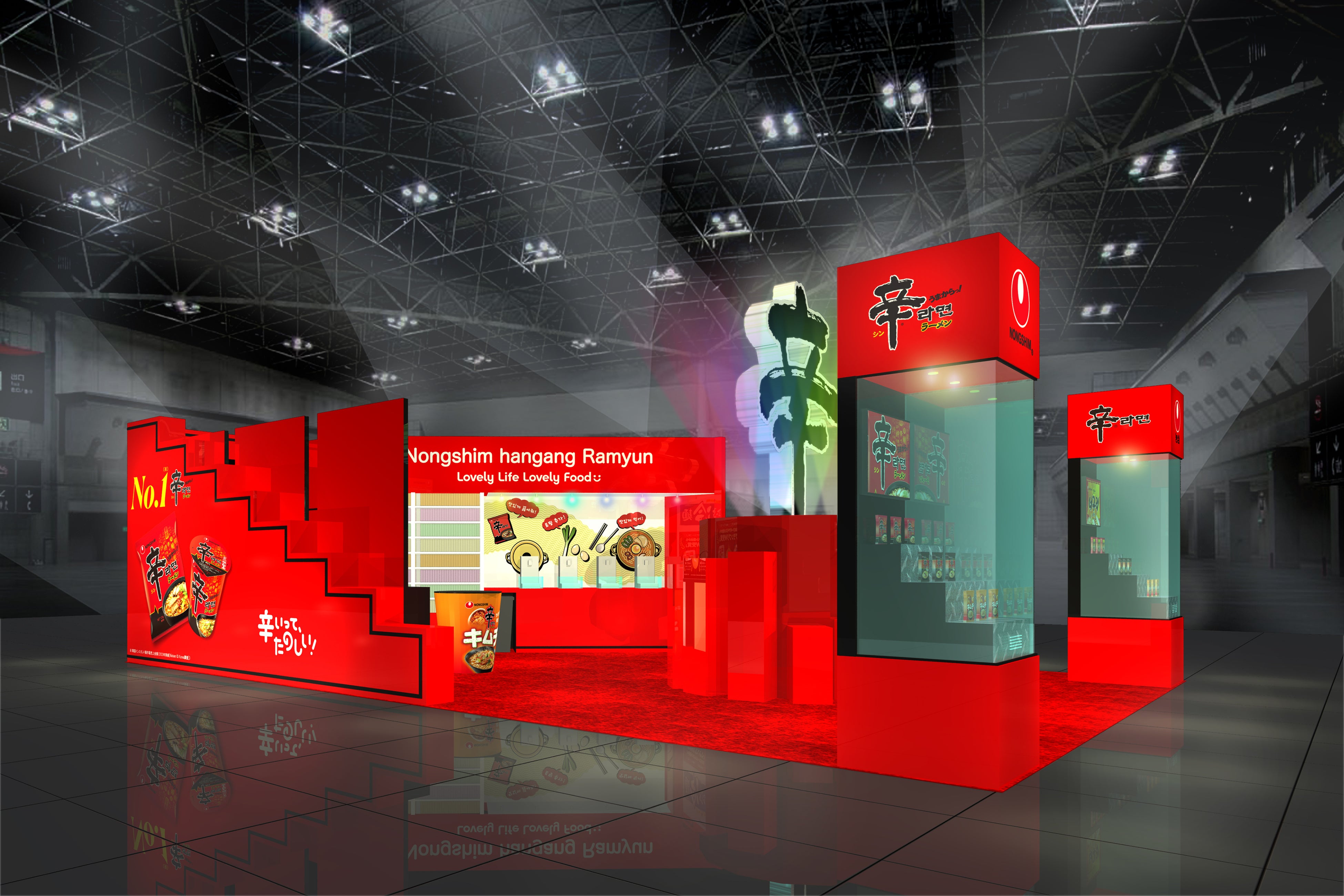 「第58回スーパーマーケット・トレードショー」での当社ブースは、代表ブランド「辛ラーメン」カラーである赤色を基調にしており、さらに巨大な「辛」の文字のモニュメントを設置することで遠くから見ても思わず目に入ってしまうデザインとなっています。今回は、特に以下の3つの見どころを設け、辛ラーメンの魅力を訴求していきます。