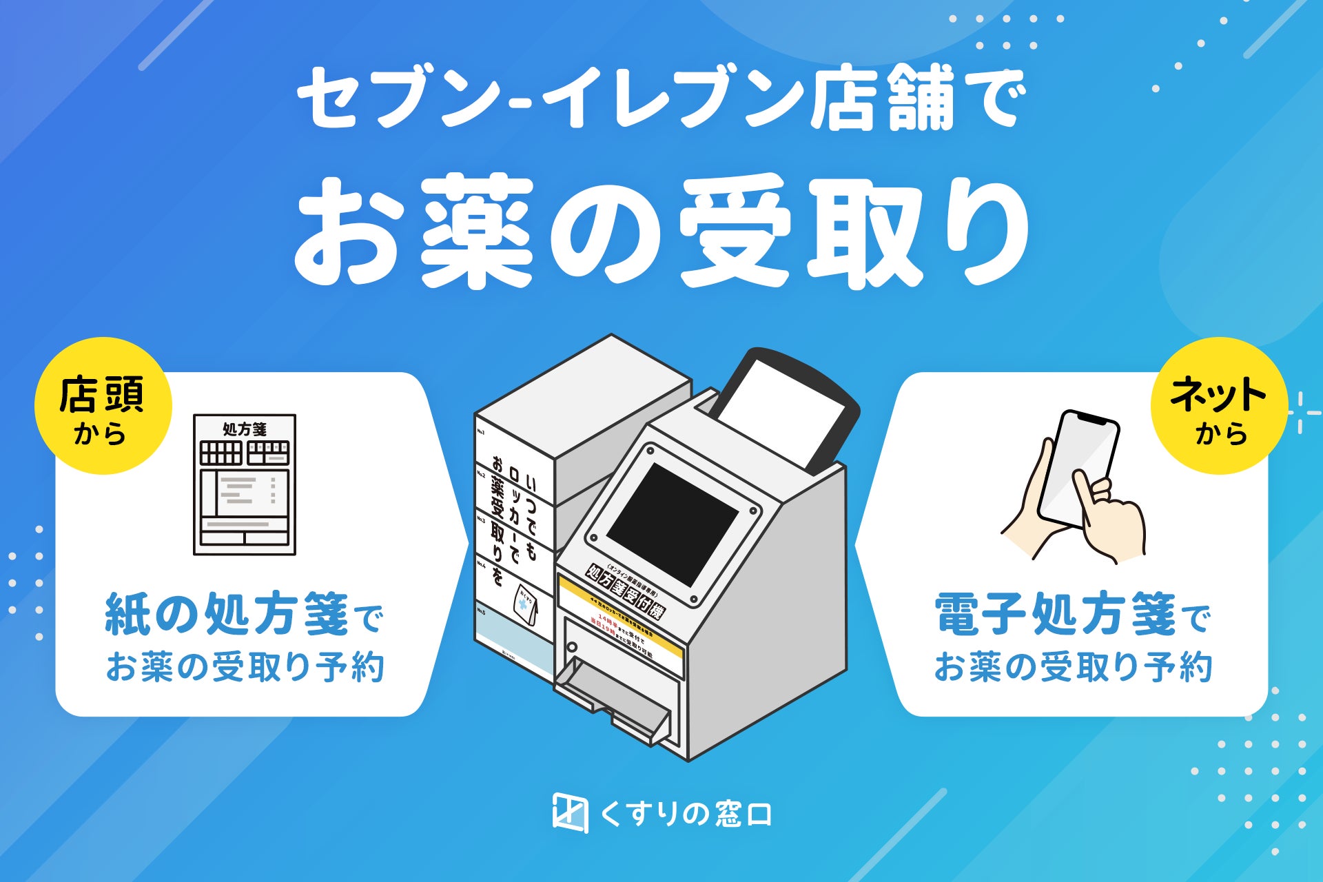 電子処方箋をお持ちの際には、当受付サービスから予約をおこない、対応する調剤薬局が準備したお薬を、対象のセブン‐イレブン店舗内設置のロッカーで受取ることができます。