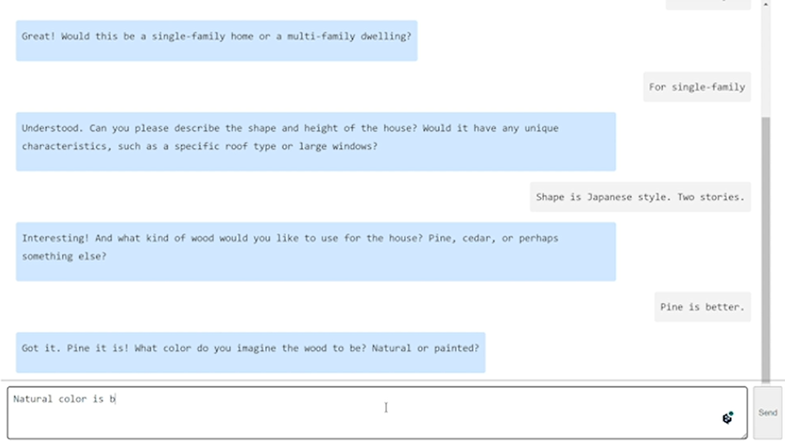 ①どのような住宅がほしいのか入力します。(日本語入力可能。例:木造住宅をつくりたいです)