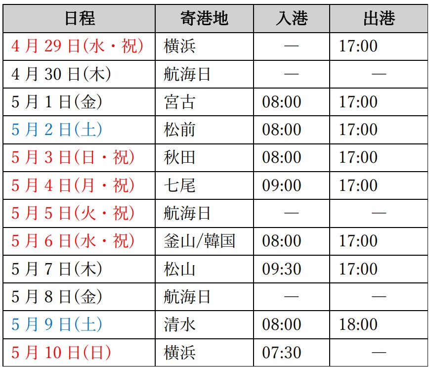 詳細とご予約はこちらから:【公式】MITSUI OCEAN FUJI|横浜発/横浜着|ゴールデンウィーク 日本一周クルーズ