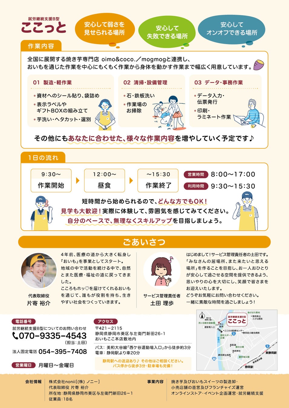 株式会社nonii(本社:静岡市、代表取締役:片寄裕介)は、2025年3月1日、静岡市葵区に就労継続支援B型事業所『ここっと』をオープンします。