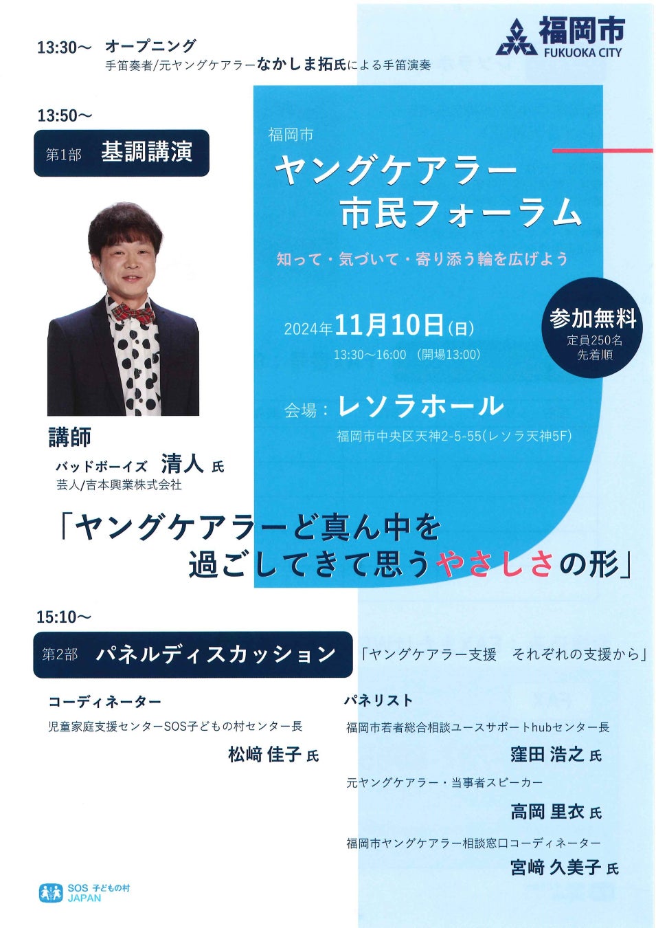 認定NPO法人SOS子どもの村JAPAN(本部:福岡市中央区赤坂1-3-14、 理事長:福重 淳一郎)は、「福岡市ヤングケアラー市民フォーラム~知って・気づいて・寄り添う輪を広げよう~」を11月10日(日)にレソラホール(福岡市中央区天神2-5-55)にて開催します。