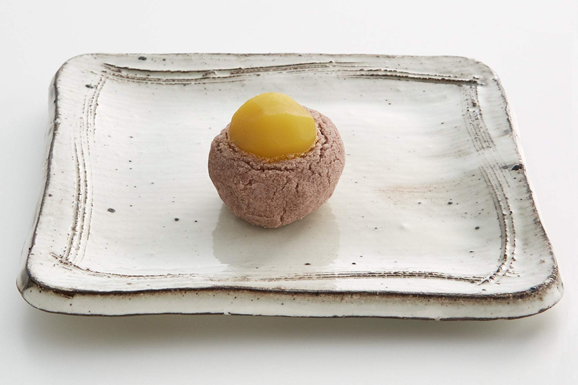 ⼩⾖の時⾬⽣地で⻩味餡を包み、蜜漬けの栗を⼀粒のせ⼗三夜の名⽉をあらわしました。愛らしく仕上げた栗名⽉は、⼝どけのよい時⾬(しぐれ)⽣地と、栗の味、⾷感をお楽しみいただけます。