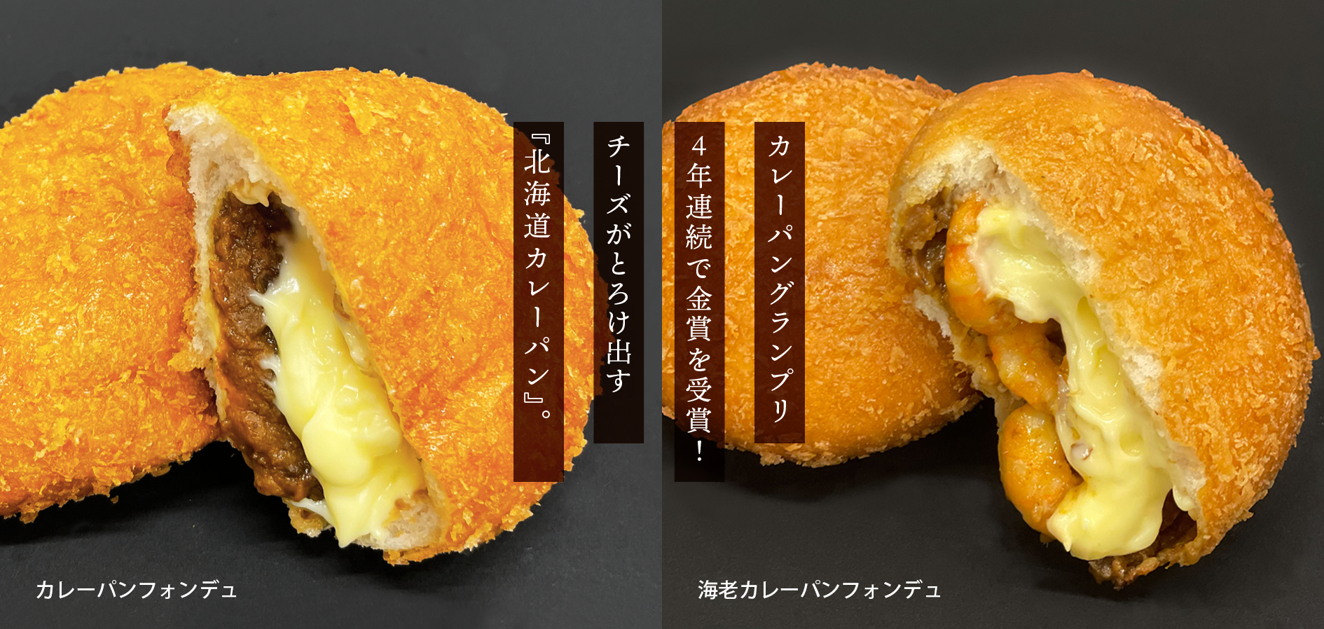外はカリッ、中はふんわり、もっちり。北海道産小麦「ゆめちから」でつくった、まるでお餅のような弾力の生地に衣をつけてカリッと揚げています。サクサクの衣の中から、特製カレールーとチーズフォンデュがとろけ出す『カレーパンフォンデュ』。カレールーに甘エビのオイルを加え、プリプリの海老が丸ごと入った『海老カレーパンフォンデュ』は、カレーパングランプリ®(※4)で4年連続・金賞を受賞しているペンギンベーカリー自慢のカレーパンです。毎日お店で揚げているので、是非、出来立ての美味しい絶品カレーパンをご賞味下さい。